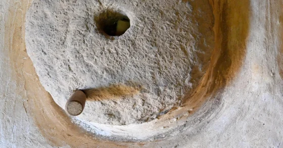The millstone, a traditional grinding tool, symbolizes women’s historical narratives and cultural heritage in Saudi Arabia, aligning with Vision 2030’s focus on preserving legacy.